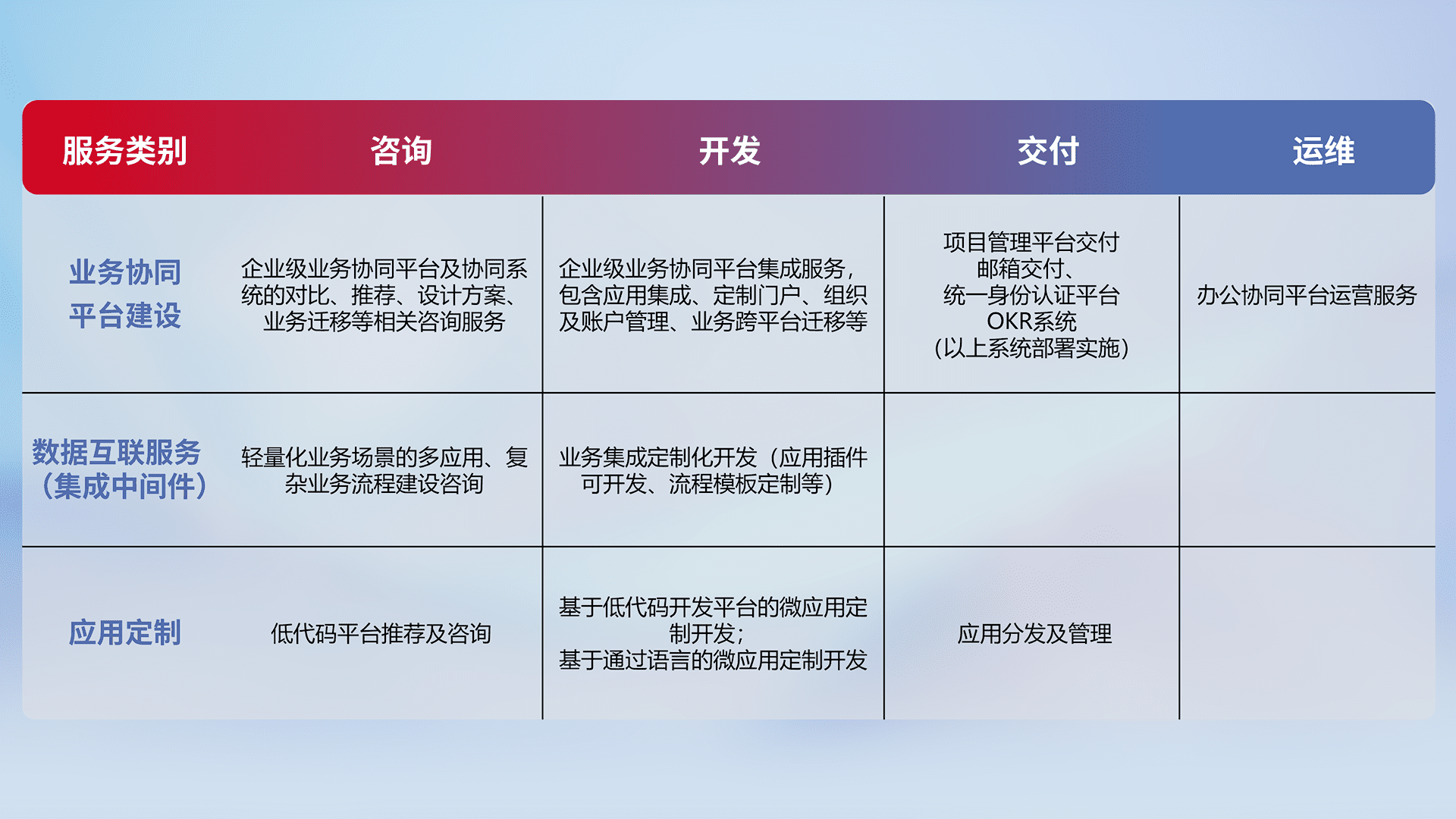 针对钉钉、、、企微、、、、IDaas等平台级产品提供产品的规划、、方案、、、交付、、、、定制化开发等服务,,,,实现如统一协同办公、、、智能客户服务、、、、混合会议管理、、、智能数据查询、、、等业务场景,,,,实现数字化转型。。